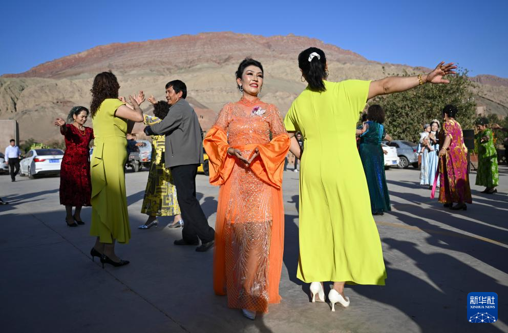 人们在新疆鄯善县吐峪沟乡吐峪沟村跳舞(10月6日摄)。