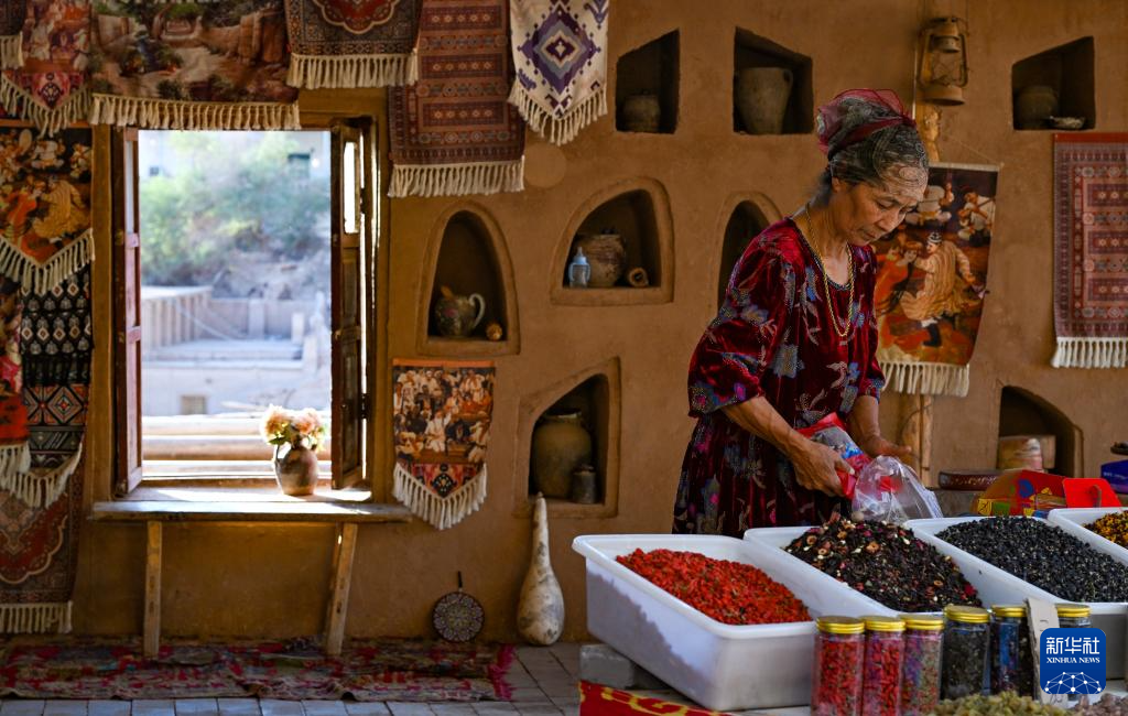 在新疆鄯善县吐峪沟乡吐峪沟村,村民美合热古丽·伊卜拉伊木在自家经营的干果摊位前(10月8日摄)。