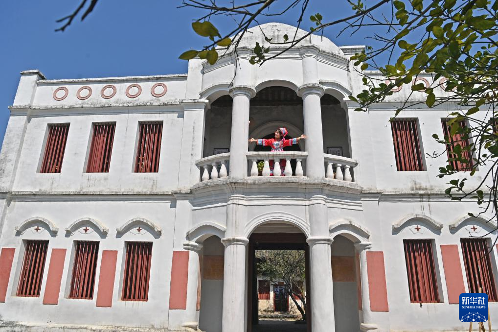 游客在运江古镇清代法式教堂打卡拍照(10月11日摄)。