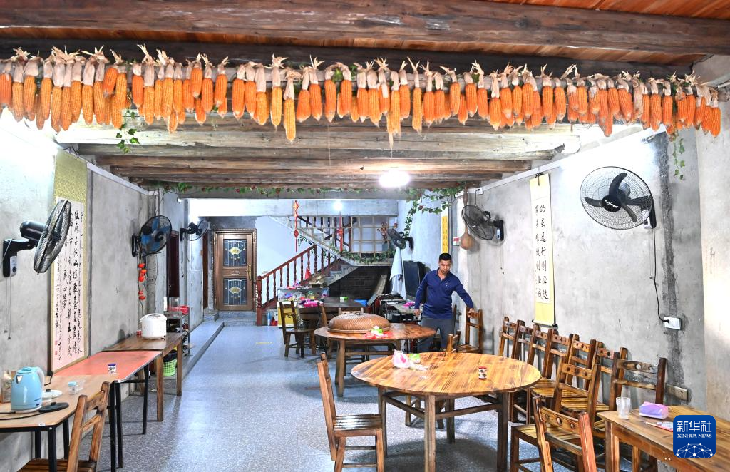 居民在运江古镇自家的民宿里整理桌椅(10月11日摄)。