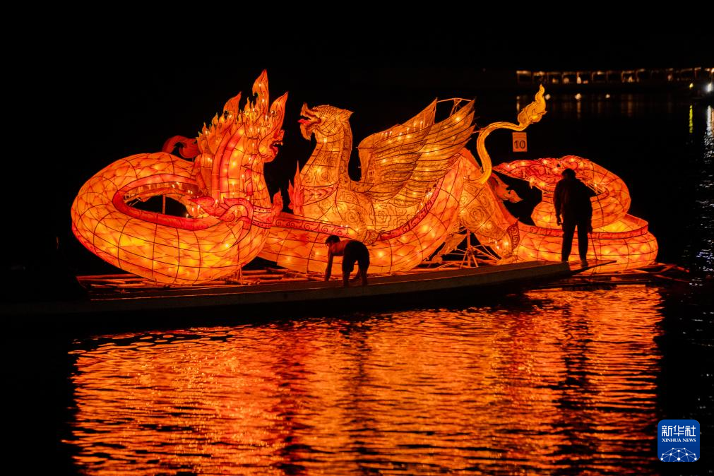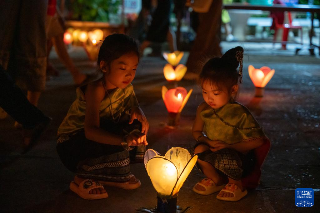 10月18日,人们在老挝琅勃拉邦点花灯庆祝灯船节。