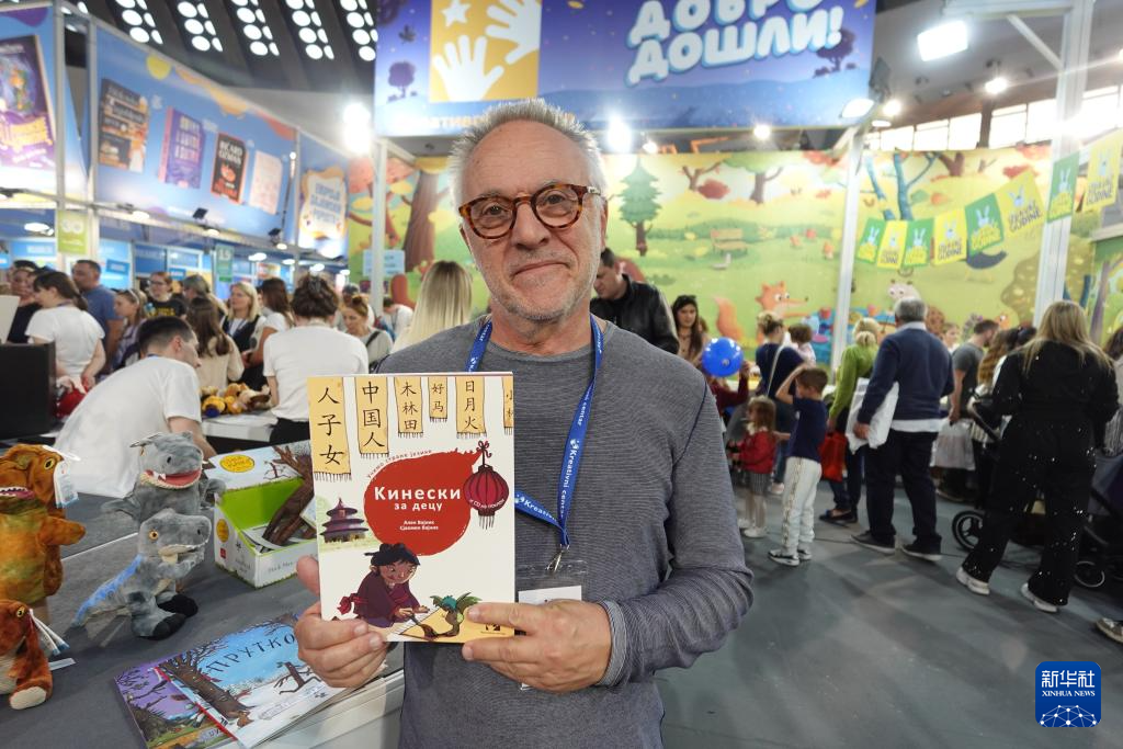 10月26日,在塞尔维亚贝尔格莱德的第67届贝尔格莱德国际书展上,本届书展“最佳出版商”奖获得者、塞尔维亚知名童书出版社“创意中心”执行经理贝戈维奇展示由该出版社出版的汉字启蒙书。
