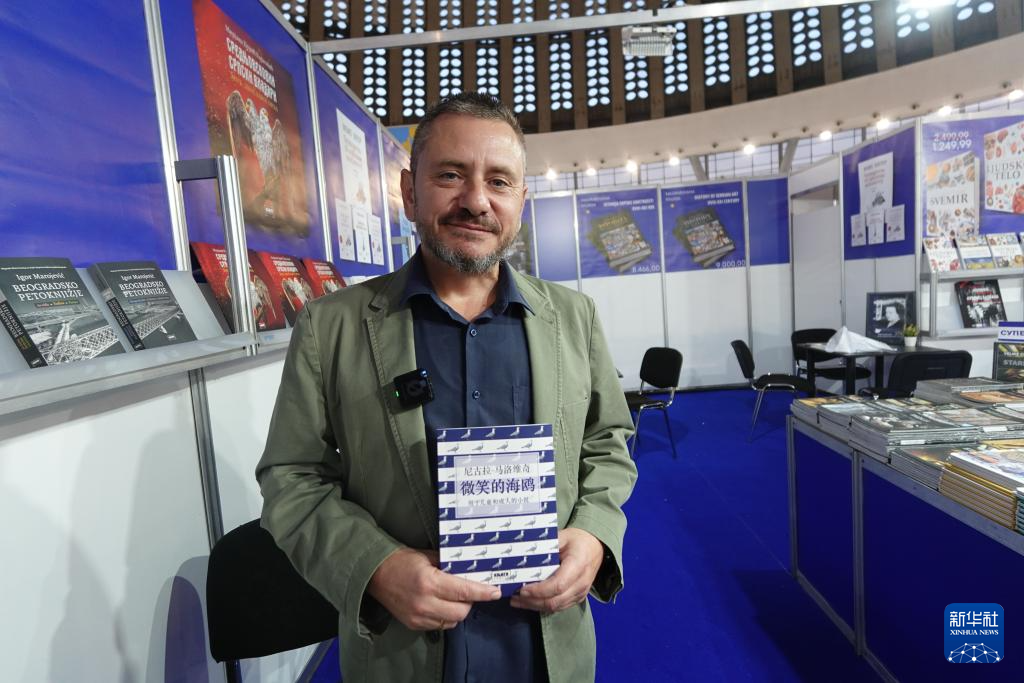 10月26日,在塞尔维亚贝尔格莱德的第67届贝尔格莱德国际书展上,来自黑山的作家尼古拉·马洛维奇展示其作品《微笑的海鸥》中文译本。