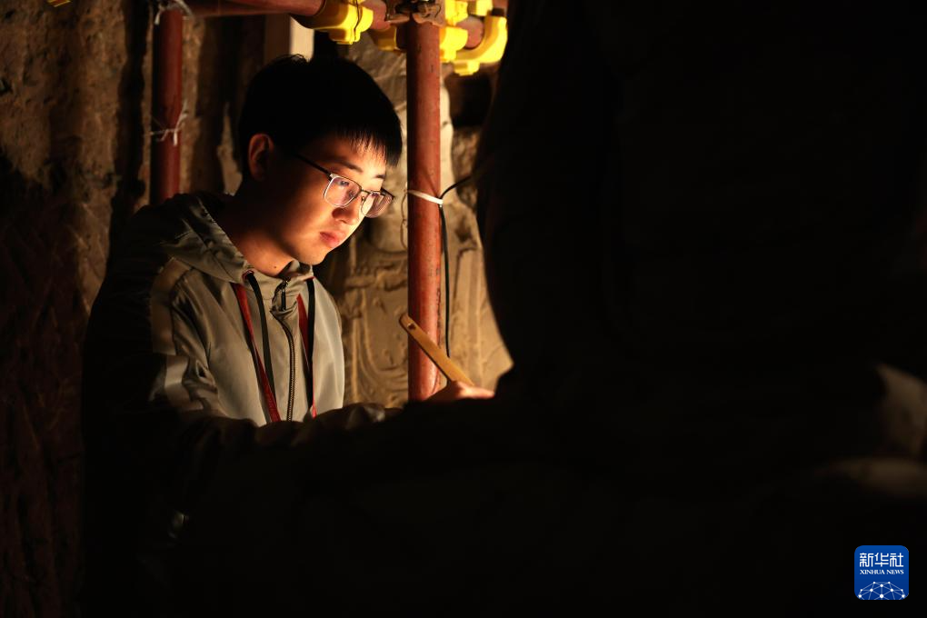 麦积山石窟艺术研究所数字中心主任董广强在查看麦积山石窟的壁画雕塑(11月2日摄)。