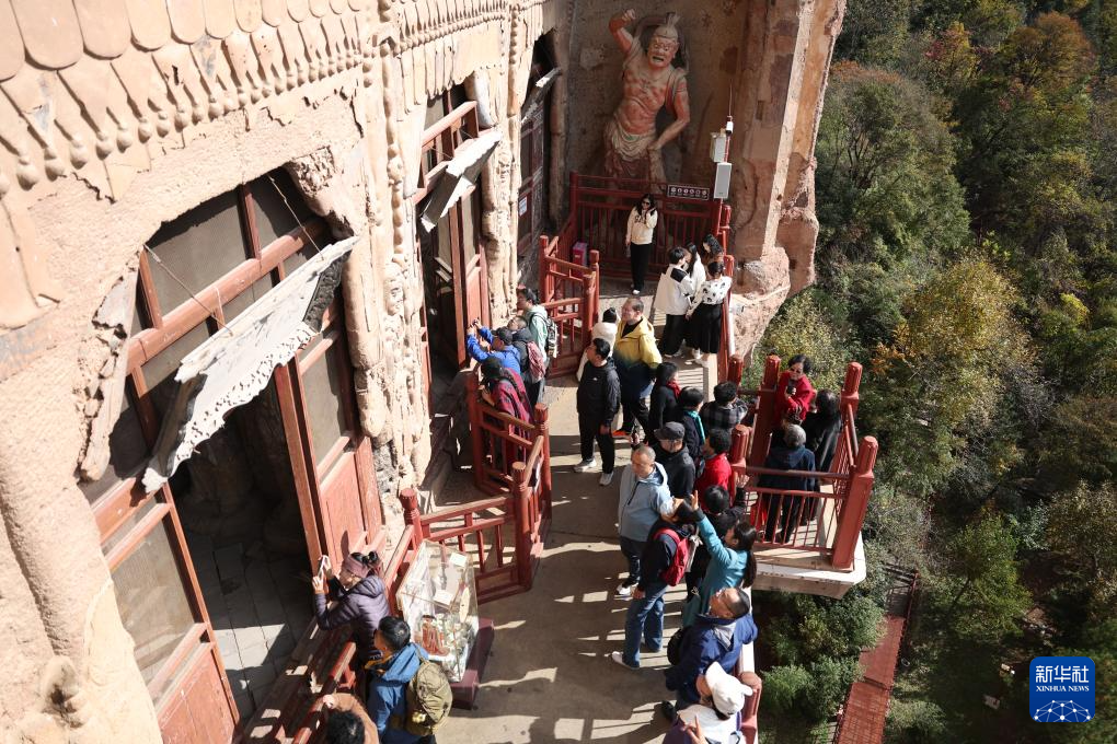 游客在麦积山石窟参观(11月2日摄)。