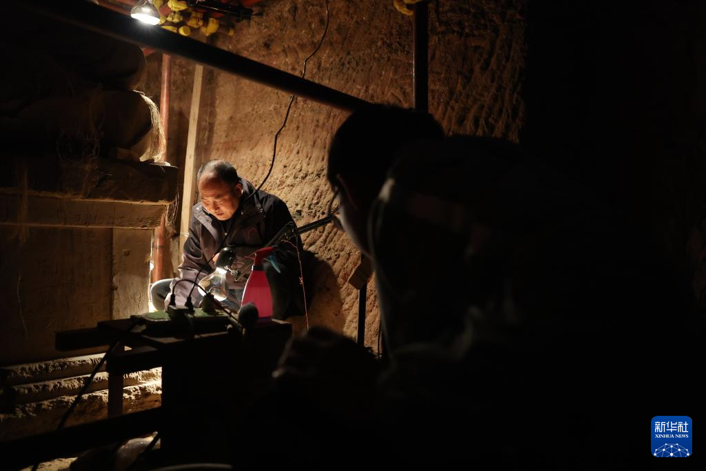 麦积山石窟艺术研究所保护研究室文物修复师牟常有(右)和何举在麦积山石窟133窟内修复塑像(11月2日摄)。