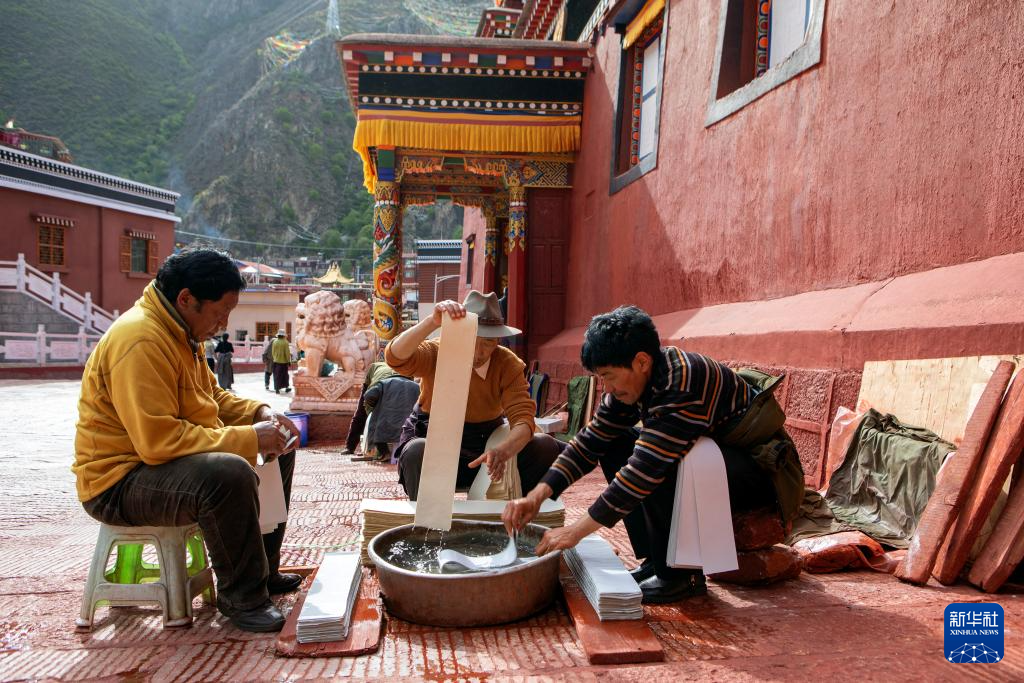 工人在德格印经院外浸泡用于印刷的纸张(2017年5月16日摄)。