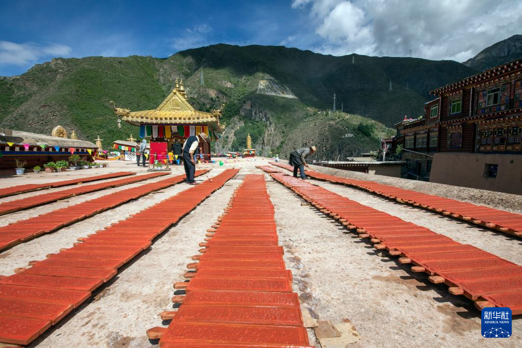 工人在德格印经院的楼顶晾晒院藏印版(2019年6月11日摄)。
