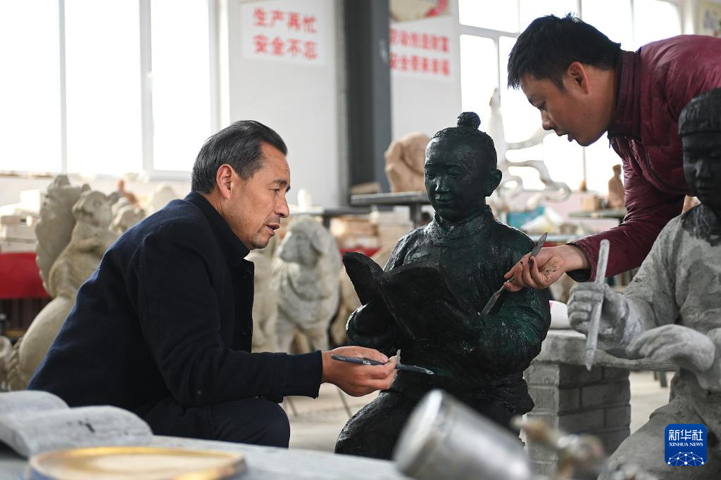 10月31日,杨佳年(左)在隆德县杨氏彩塑生产车间对学生进行指导。