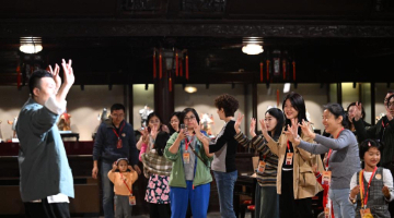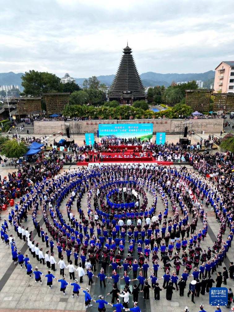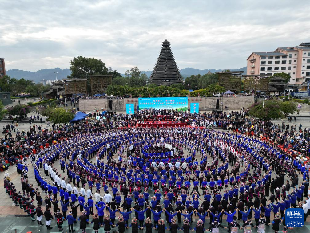 11月9日,侗族群众聚集广西三江侗族自治县多耶广场,跳千人多耶,庆祝侗族传统多耶节(无人机照片)。