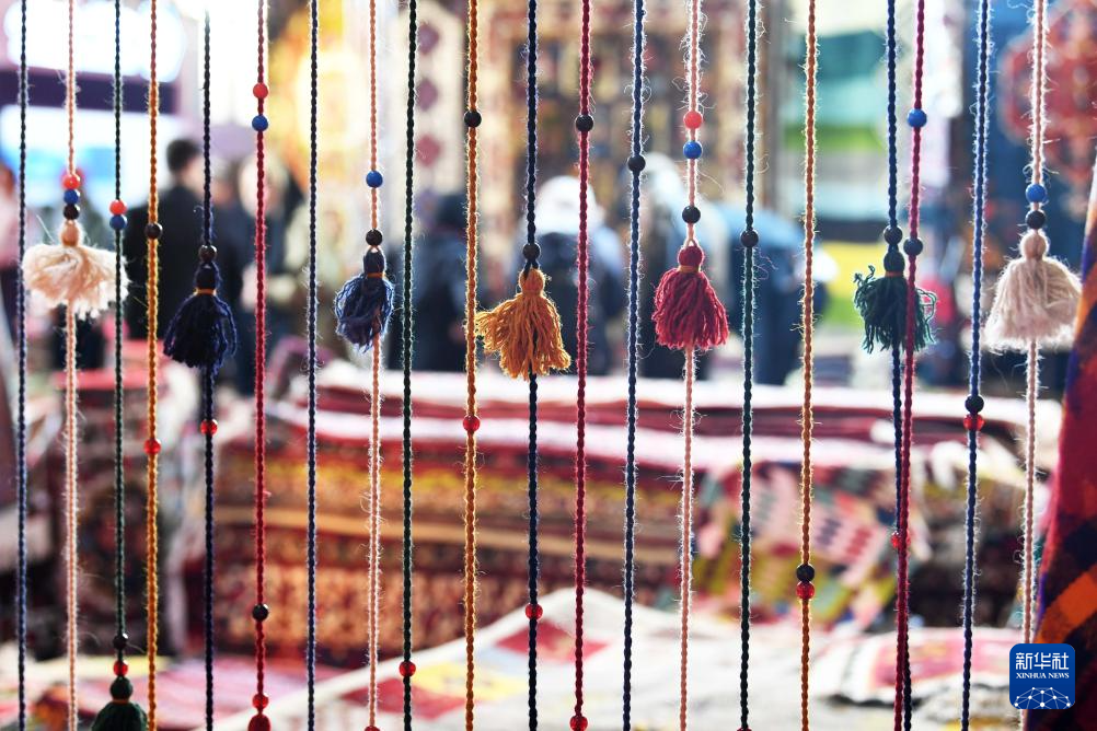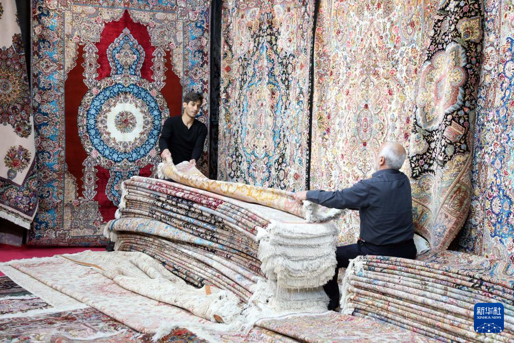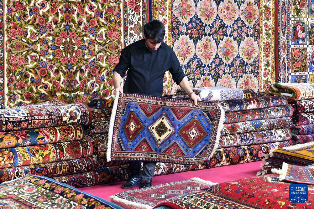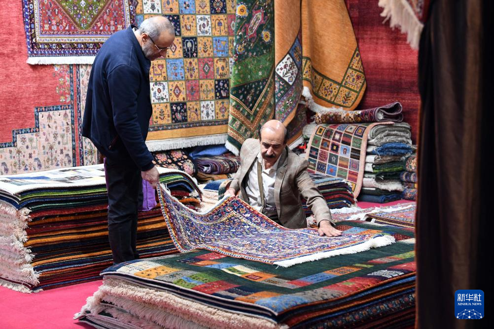 11月14日,在伊朗首都德黑兰,伊朗国际手工地毯展的参展商整理地毯。