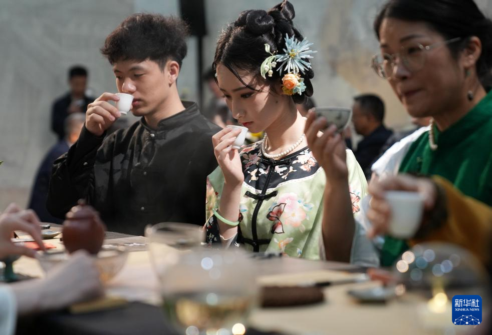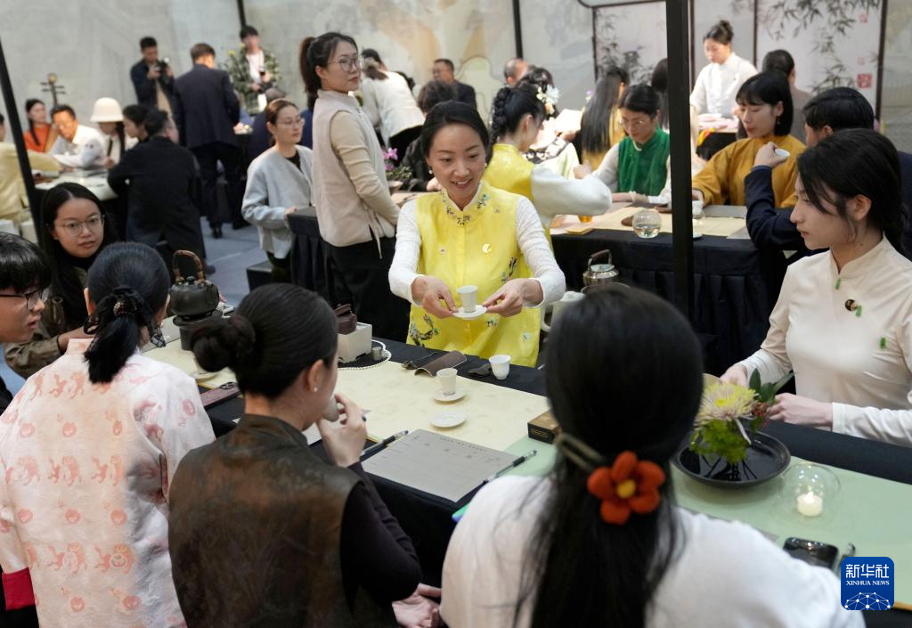 11月14日,人们在杭州秋季茶博会上举行的一场茶会中品茶。
