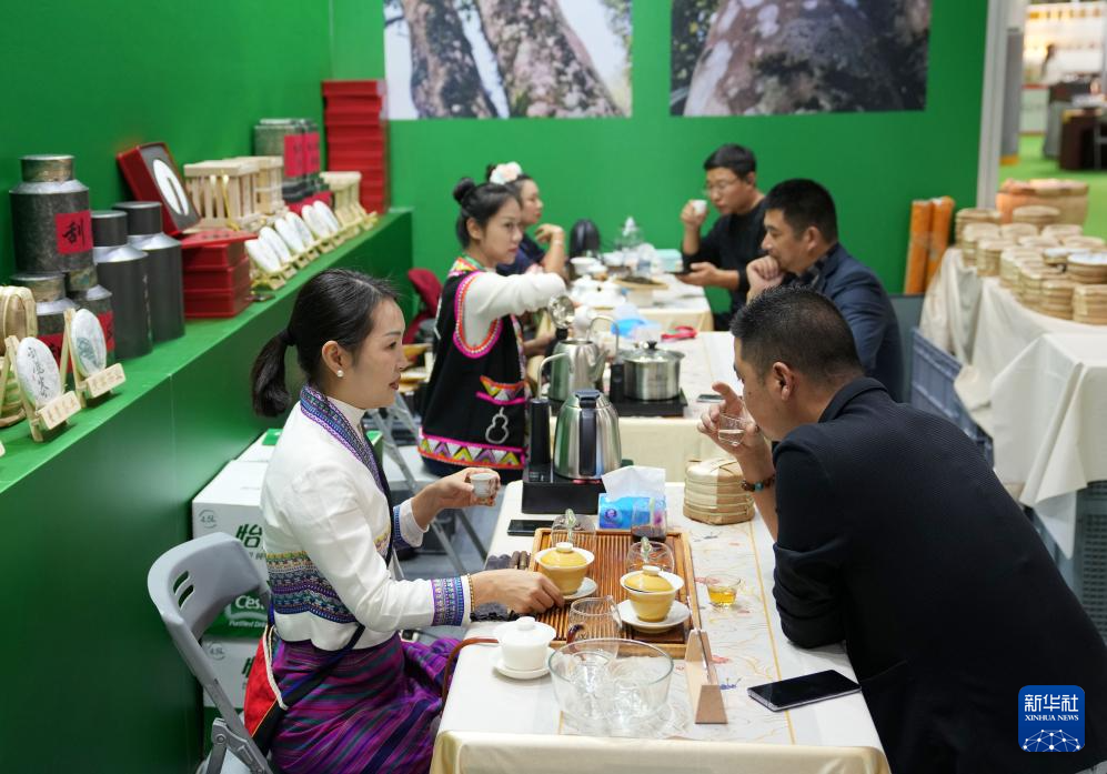 11月14日,人们在杭州秋季茶博会一家参展商展位上品茶。