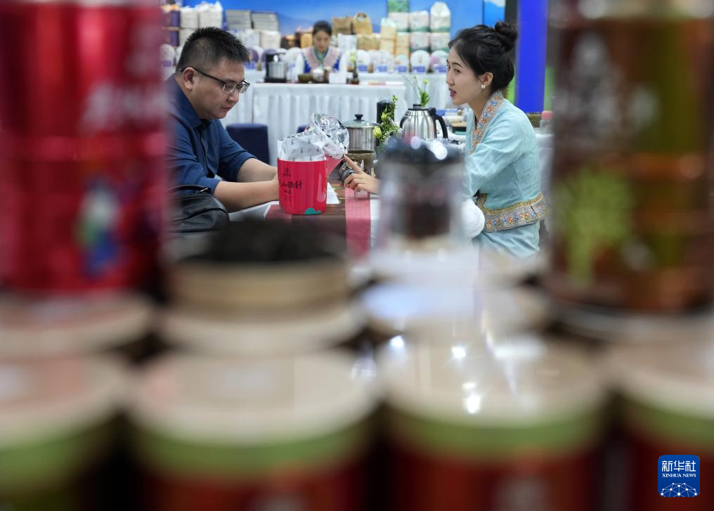 11月14日,一家参展商的工作人员(右)在杭州秋季茶博会上向来宾推介茶叶。