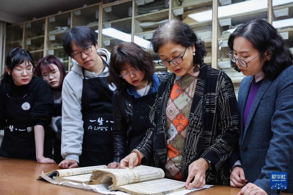 11月19日,国家级古籍修复技艺传习中心天一阁博物馆传习所导师王金玉(右二)在给修复中心的修复师们上课。