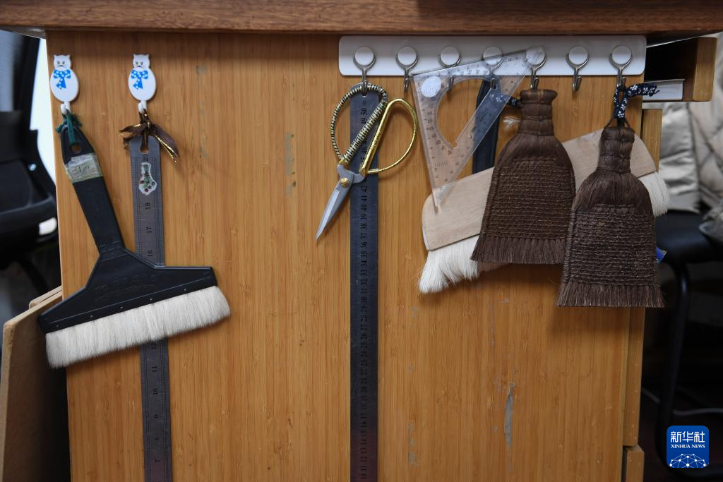 11月18日在天一阁文物修复中心拍摄的一位古籍修复师桌边的工具。