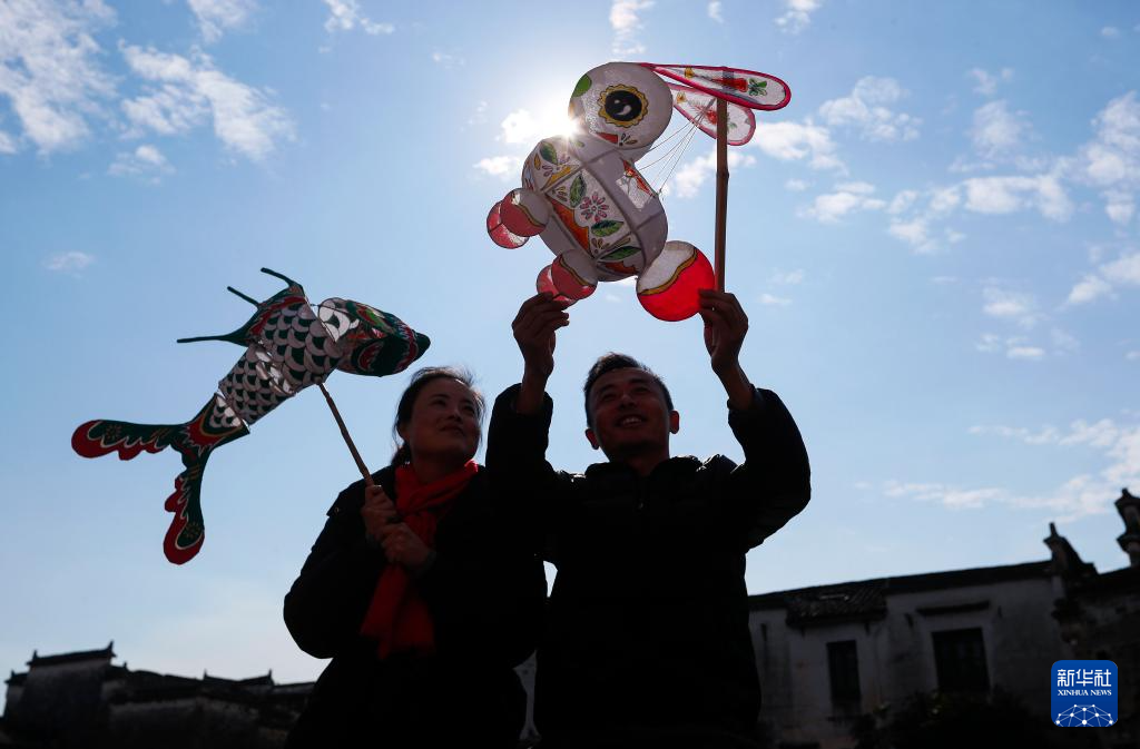 12月9日,在安徽省黄山市黟县宏村,何继星在查看花灯。