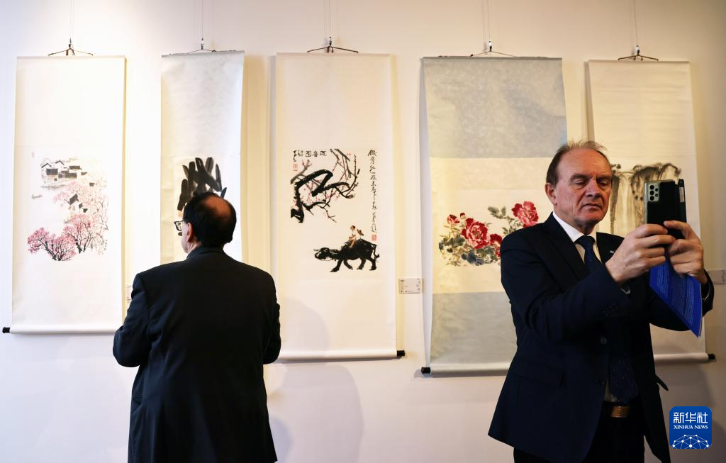 12月20日,在法国巴黎中国文化中心,嘉宾在“心境映象——荣宝斋当代艺术展暨木版水印特展”上参观。