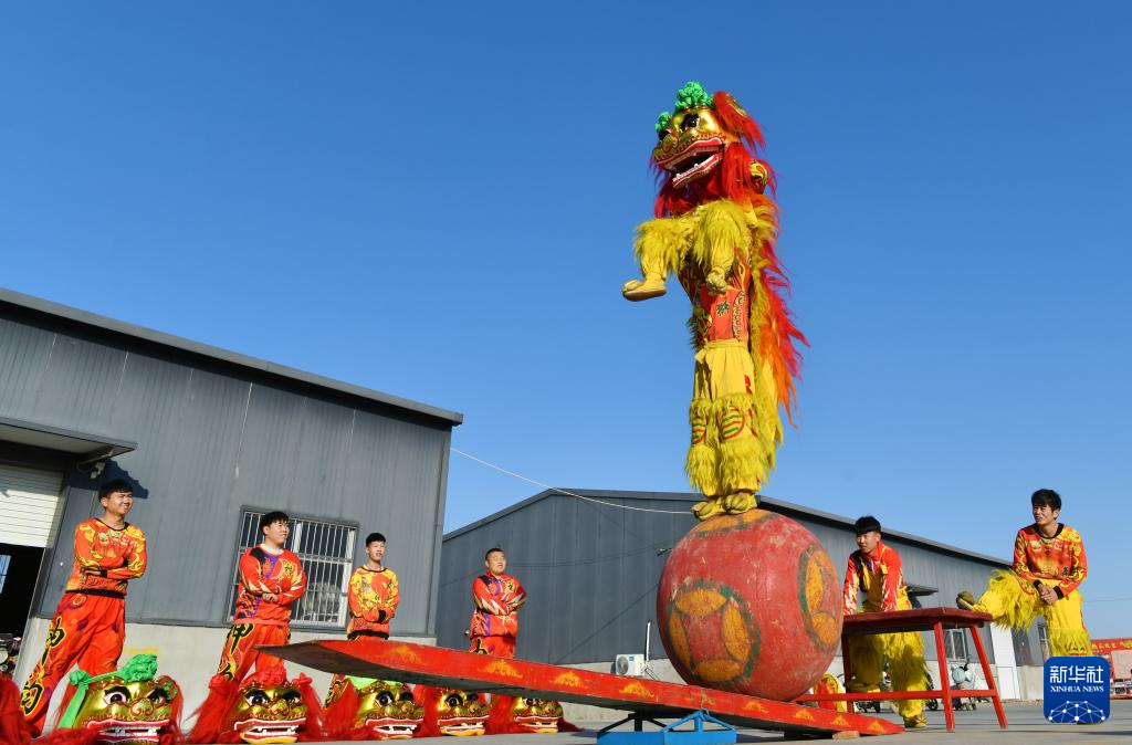 12月20日,河北省沧州市沧县神韵舞狮传承基地的学员们在进行狮子滚绣球训练。