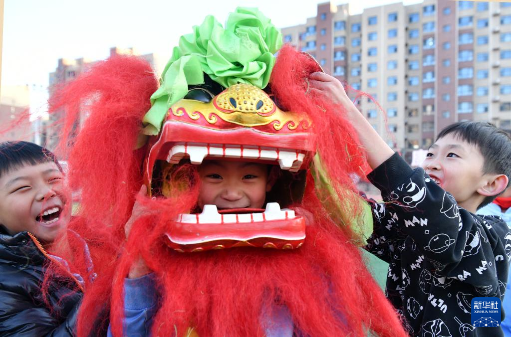 12月20日,河北省沧州市重庆路小学舞龙舞狮社团的学生在与舞狮艺人互动。
