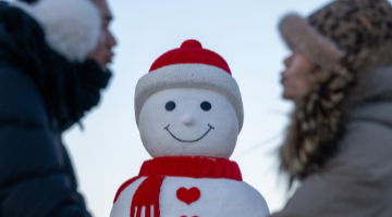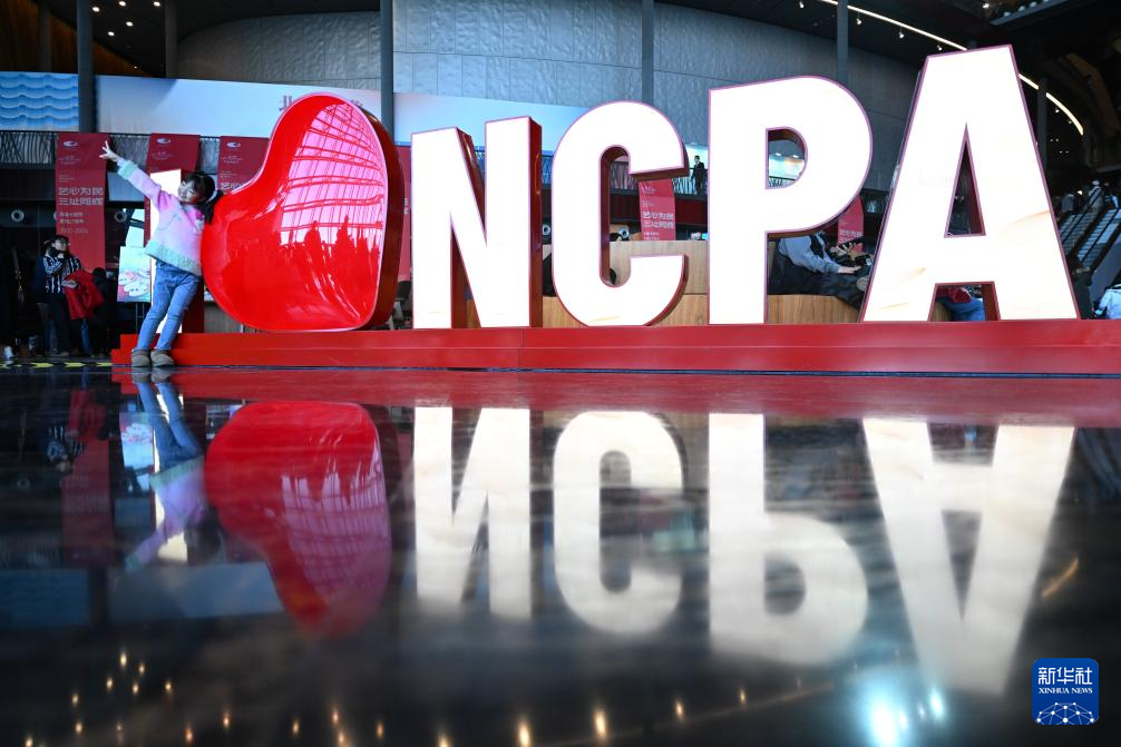 12月22日,一名小朋友在“我爱国家大剧院”装置前打卡留念。