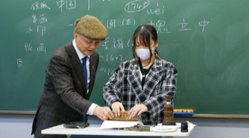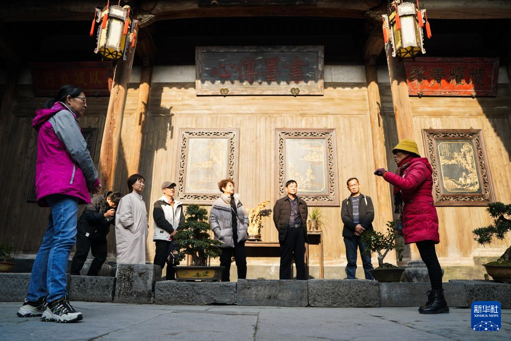 12月18日,胡晓雯(右一)在西递村敬爱堂中为游客讲解。