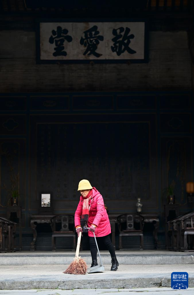 12月18日,胡晓雯在西递村敬爱堂内打扫卫生(无人机照片)。