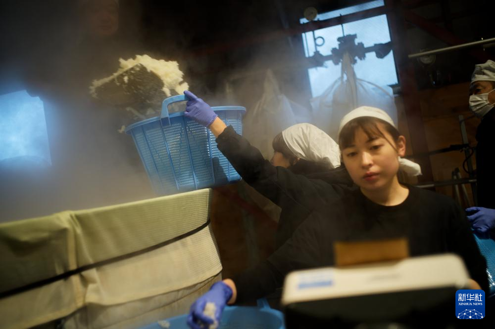 12月17日,在日本福井县常山酒厂,工人将刚蒸好的米装篮称重。