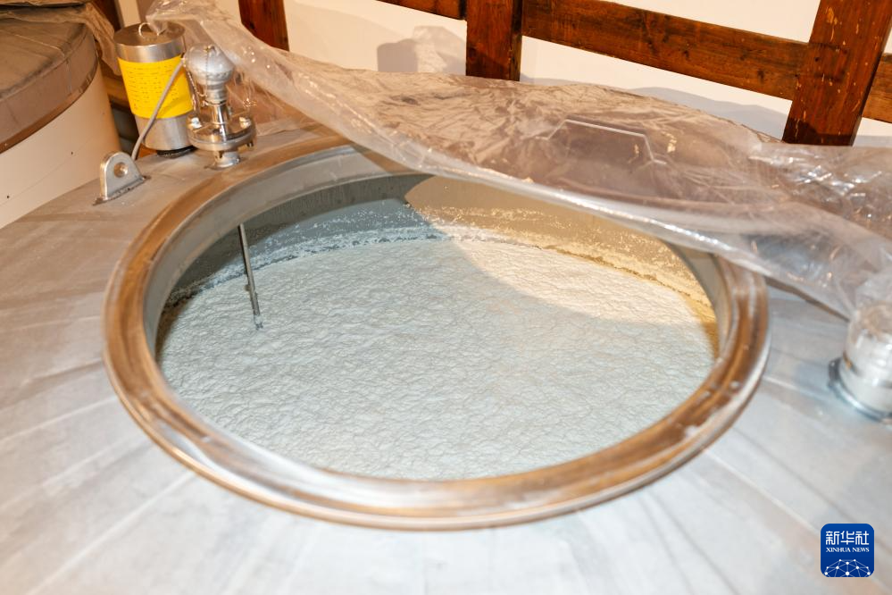 这是12月16日在日本福井县的常山酒厂酿造间拍摄的正在静置发酵的酒醪。