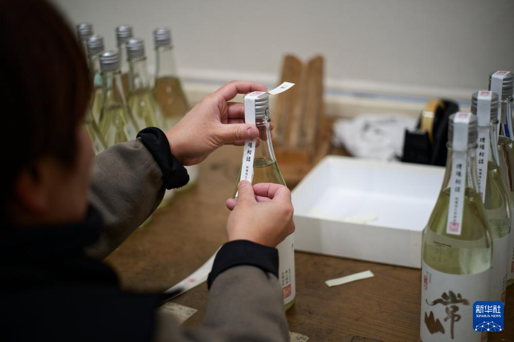 12月17日,在日本福井县常山酒厂,工人为清酒贴上标签封瓶。