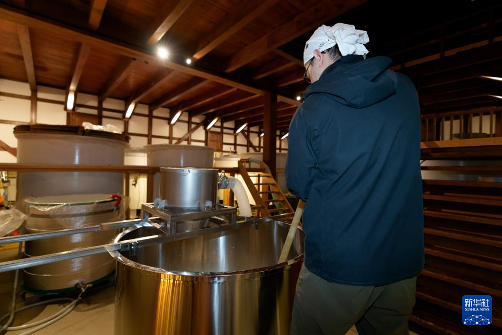 12月17日,工人在日本福井县常山酒厂搅拌添加过蒸米、麹和水的酒母。
