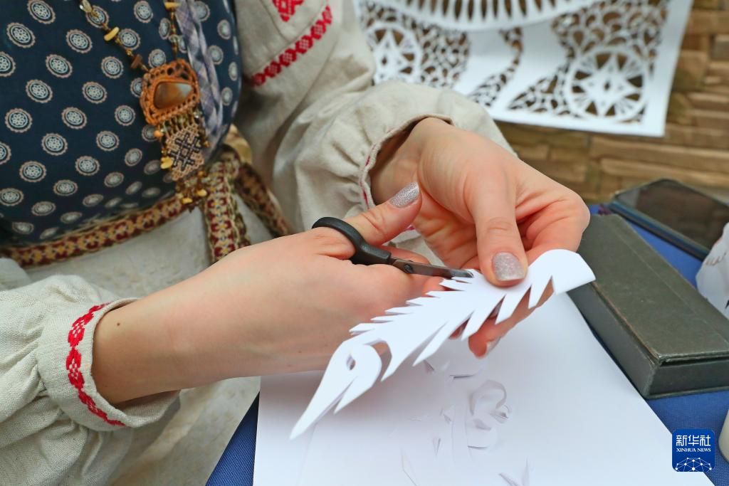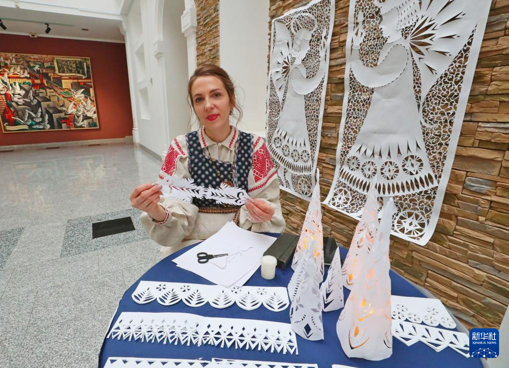 12月23日,在白俄罗斯首都明斯克,艺术家在展示白俄罗斯剪纸技艺。
