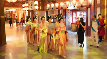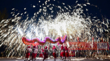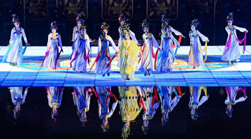 2021年4月10日,演员在大型实景剧《文成公主》中表演藏戏片段。拉萨布制面具制作技艺西藏自治区级非遗传承人西洛创办的拉萨市达孜区雪乡扎西岗传统手工艺合作社多次为该剧提供道具支持。