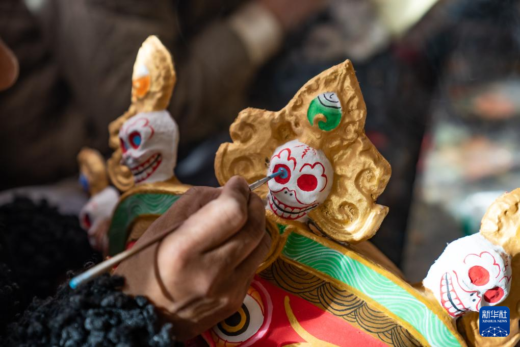 12月9日,拉萨布制面具制作技艺西藏自治区级非遗传承人西洛(中)和同事一起制作西藏传统面具。西洛是拉萨布制面具制作技艺的西藏自治区级非遗传承人,他制作的面具广泛运用于藏戏表演中。2012年,在政府的扶持下,西洛创办了拉萨市达孜区雪乡扎西岗传统手工艺合作社。近年来,合作社不断吸纳当地群众学习面具制作技艺,不仅为当地群众提供就业机会,同时也助力非物质文化遗产的保护和发展。