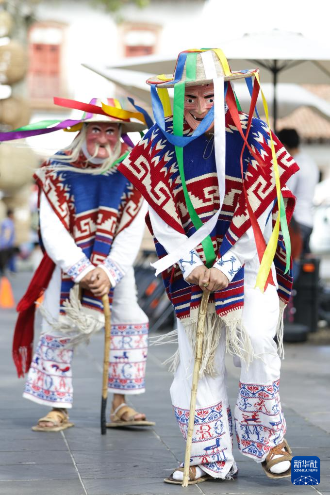 墨西哥的面具舞也是一种具有浓郁当地特色的传统舞蹈。舞蹈中的面具制作精美,色彩鲜艳,往往具有象征意义,代表着不同的角色和身份。墨西哥面具舞中的“老者之舞”是墨西哥米却肯州最具代表性的传统舞蹈之一,起源于普列佩查原住民文化,据说发展自墨西哥独立之前人们向心目中的神明祈求丰收的仪式。舞者表演“老者之舞”时往往戴着略显夸张的面具,面具通常带有皱纹、胡须和微笑的表情,借以塑造一种看似滑稽、幽默却充满智慧的形象。