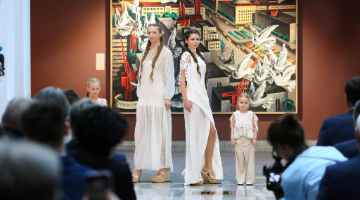 12月29日,在山东青岛西海岸新区泊里大集,一名消费者在试穿新年喜庆服装。