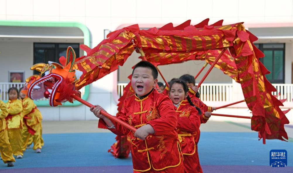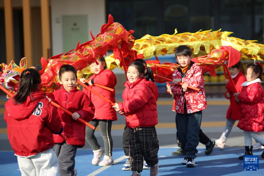 12月30日,河南省焦作市博爱县实验幼儿园的孩子们表演舞龙迎新年。