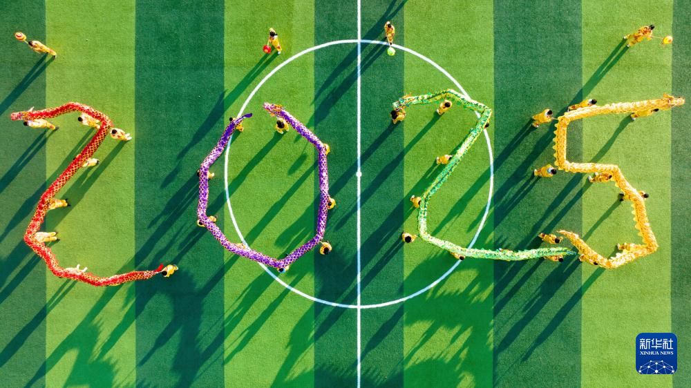 12月30日,江苏省昆山开发区实验学校的学生在操场上舞龙迎新年(无人机照片)。