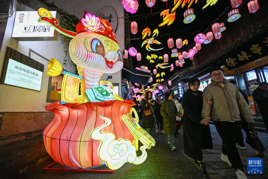 12月29日,游客在南京老门东历史文化街区赏灯游玩。