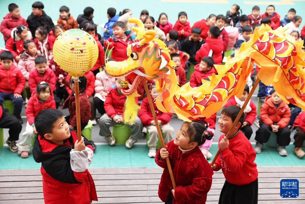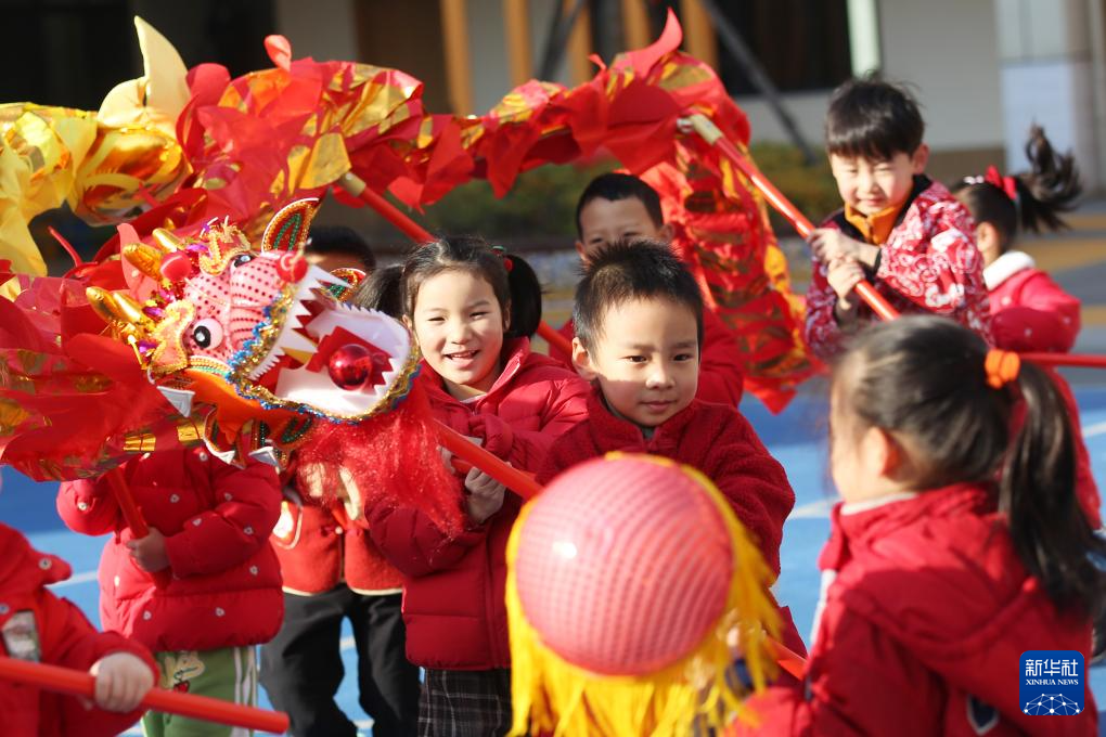 12月30日,孩子们在浙江省湖州市德清县中心幼儿园舞龙迎新年。