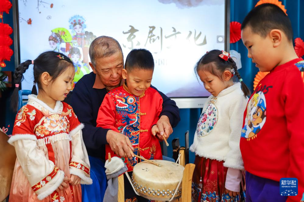 12月30日,在山东省青岛市李沧区青峰路幼儿园举行的品非遗迎新年活动中,戏曲演奏者指导小朋友体验戏曲乐器。