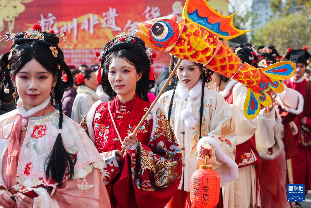当日,“宋韵思潮 寻迹匠心”杭州非遗年货节在杭州市上城区望江街道日信国际广场开市,现场设置非遗、文创、游艺、民俗、群艺五大板块,汇集非遗项目展示体验,穿插民俗文艺表演,同时推出各地年节美食品尝展销,营造杭州特色的市井年味,让市民游客在欢乐喜庆的气氛中感受年味。