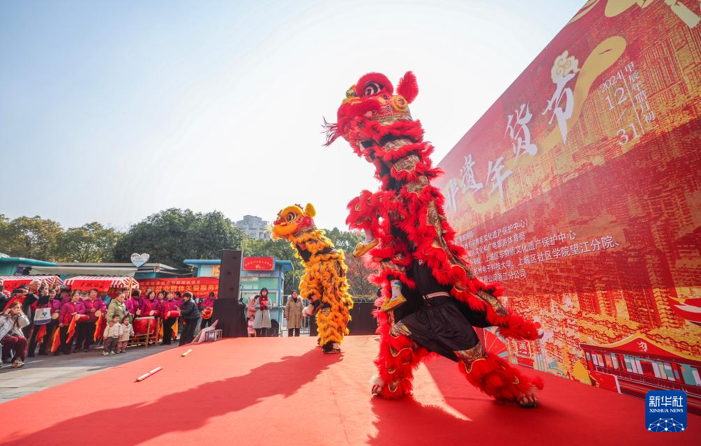 12月31日,舞狮队在年货节现场与市民游客互动。