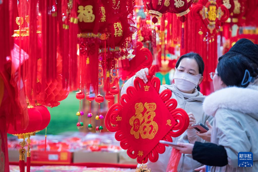 1月14日,顾客在昆明滇池国际会展中心挑选新春饰品。