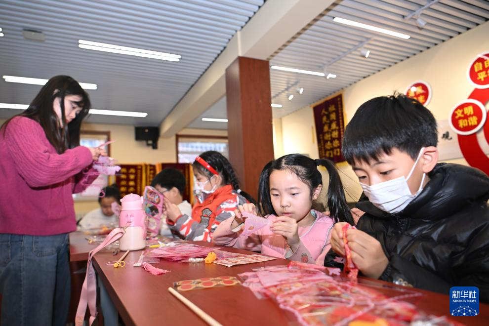1月16日,在天津市河东区大王庄街道麟祥里社区活动室,社区志愿者带领小朋友了解春节民俗。