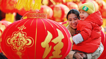 1月19日,身着汉服的居民在社区庙会上猜灯谜。