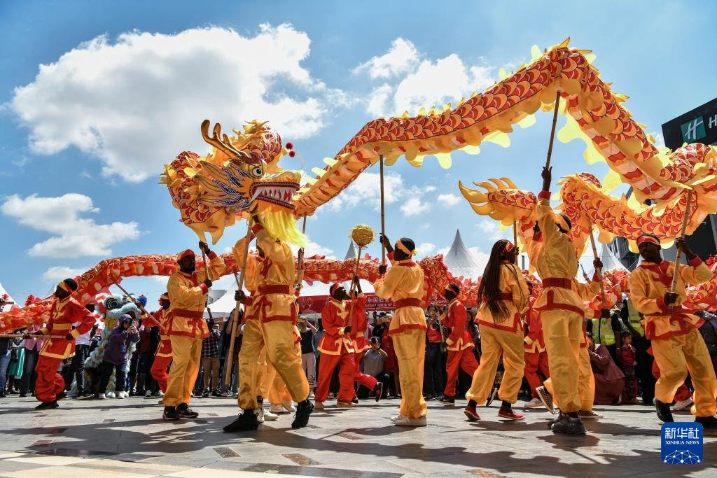 1月19日,演员在肯尼亚首都内罗毕举行的中国春节庙会活动上表演舞龙