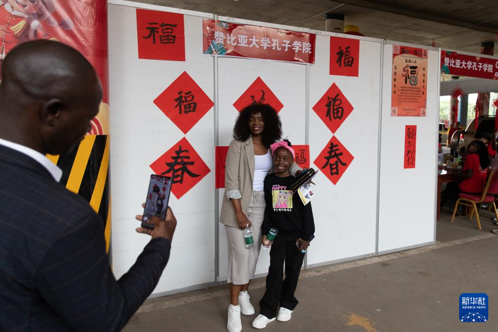 1月19日,在赞比亚首都卢萨卡举行的春节庙会活动上,人们在赞比亚大学孔子学院的展区前合影留念。