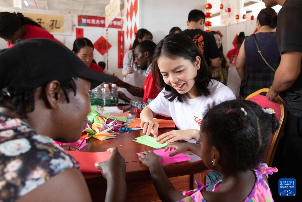 1月19日,在赞比亚首都卢萨卡举行的春节庙会活动上,一名赞比亚大学孔子学院的老师教一名小朋友折千纸鹤。