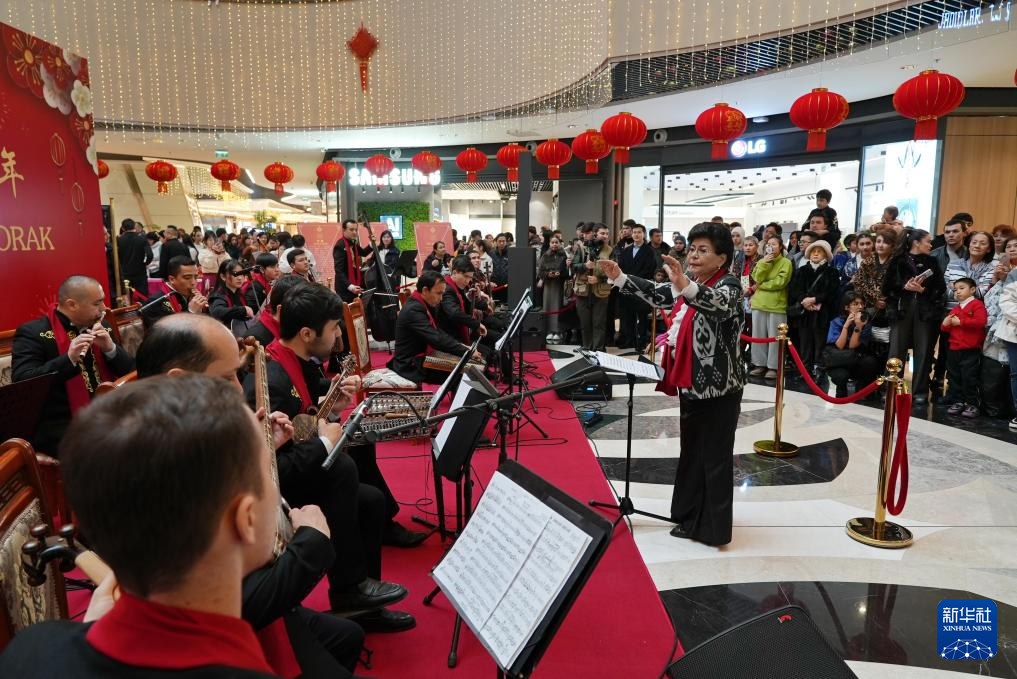 1月19日,在乌兹别克斯坦首都塔什干的一处购物中心,表演者在“欢乐春节·共庆中国年”活动上演奏乐曲。